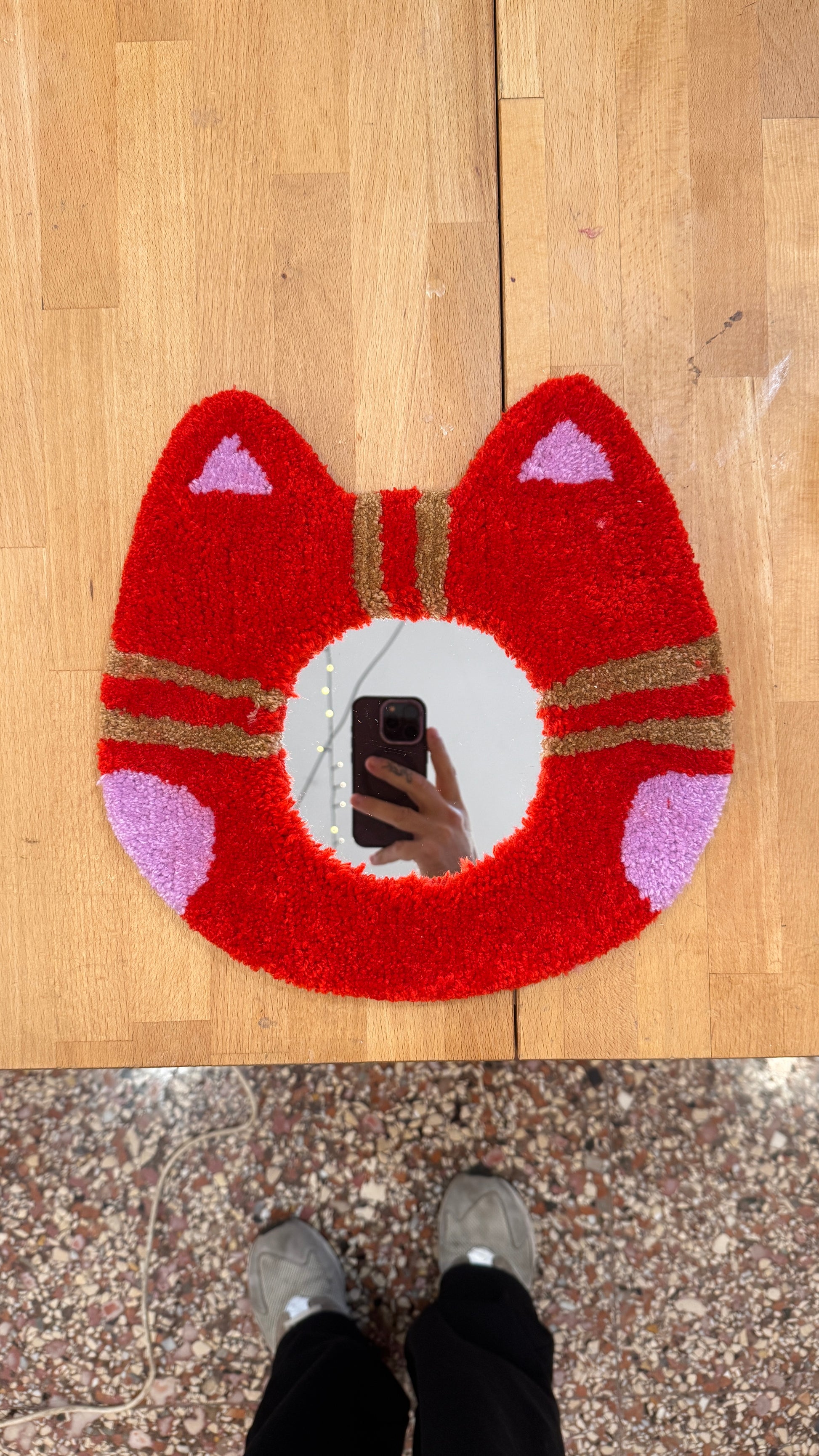 Specchio tuftato a mano in filato acrilico, ispirato alla forma di un tenero gatto.